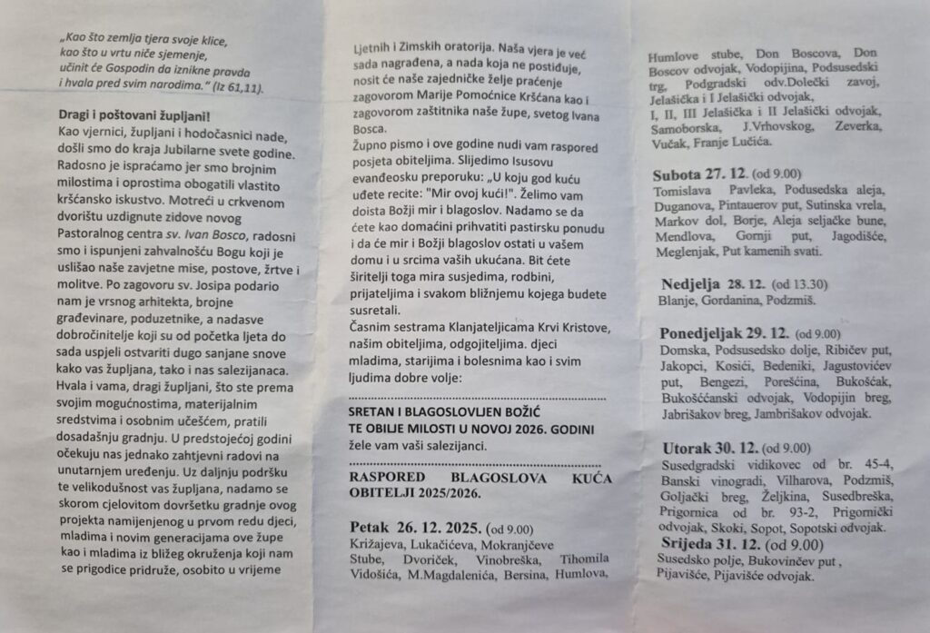 Božićna poruka i raspored blagoslova kuća